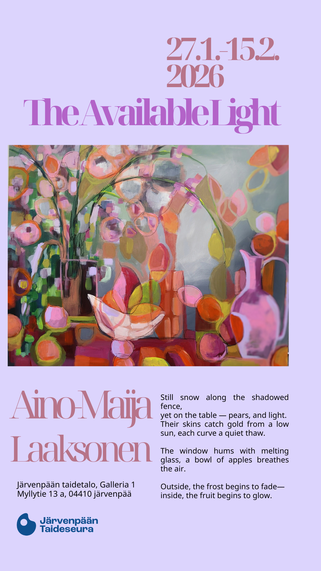 Tämä näyttely kuljettaa katsojaa valon ja varjon hiljaisessa vuoropuhelussa kohti toivoa ja pikku hiljaa saapuvaa kevättä. Asetelmat muuntuvat tutkielmiksi väreistä, valosta ja muodosta. Teokset avaavat tilaa kevään odotukselle – hetkeen jolloin pimeys väistyy ja valo alkaa löytää uusia reittejä ja sävyjä kaiken harmaan jälkeen.
