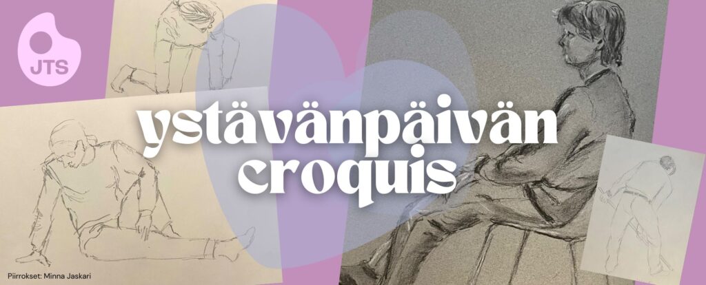 Tervetuloa piirtämään croquis´ta rennolla otteella Ystävänpäivän hengessä! Ollaan toisillemme vuoron perään malleina 2–5 minuutin pätkissä. Asu on vapaa, hassut hatut ja muu rekvisiitta suotavia, muttei pakollisia. Vapaaehtoinen loppukatselmus illan tuotoksista. Ota mukaan omat vapaavalintaiset piirustusvälineet. Tarjolla pientä sydämellistä purtavaa!