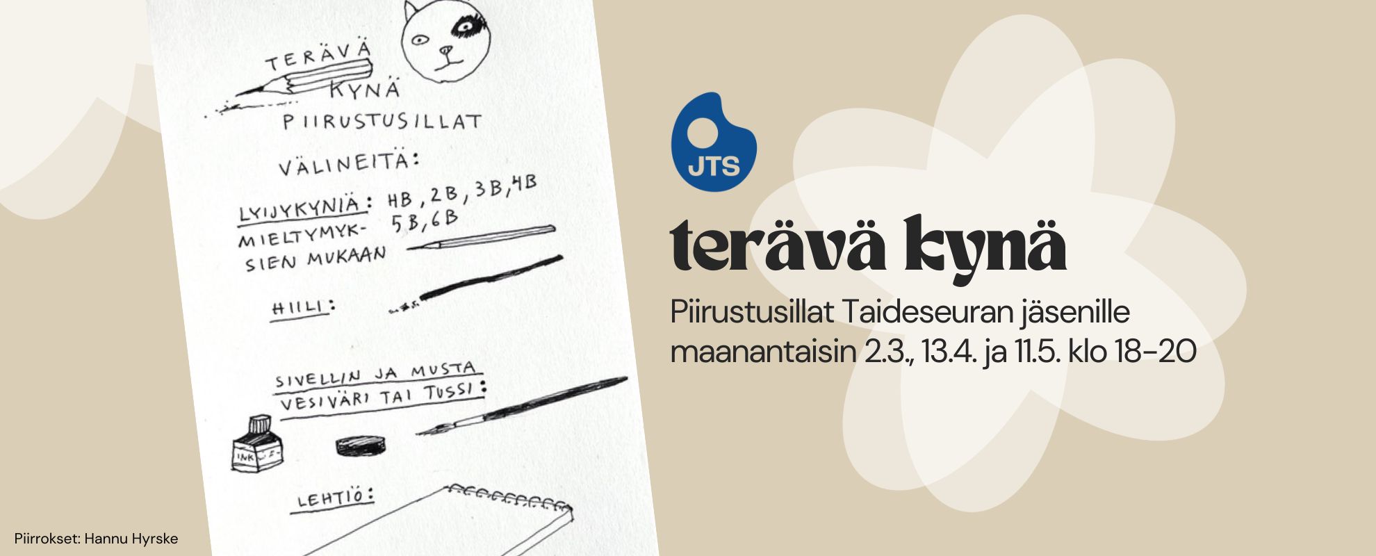 Taideseuran jäsenillat tarjoavat mukavaa tekemistä matalalla kynnyksellä ja maksuttomasti. Olet lämpimästi tervetullut mukaan. Jäseniltojen ajat ja aiheet kerrotaan tällä sivulla. Joihinkin iltoihin on ennakkoilmoittautuminen, kaikkiin ei. Mahdollinen ilmoittautuminen ja tarvittavat välineet kerrotaan tapahtuman tietojen yhteydessä.