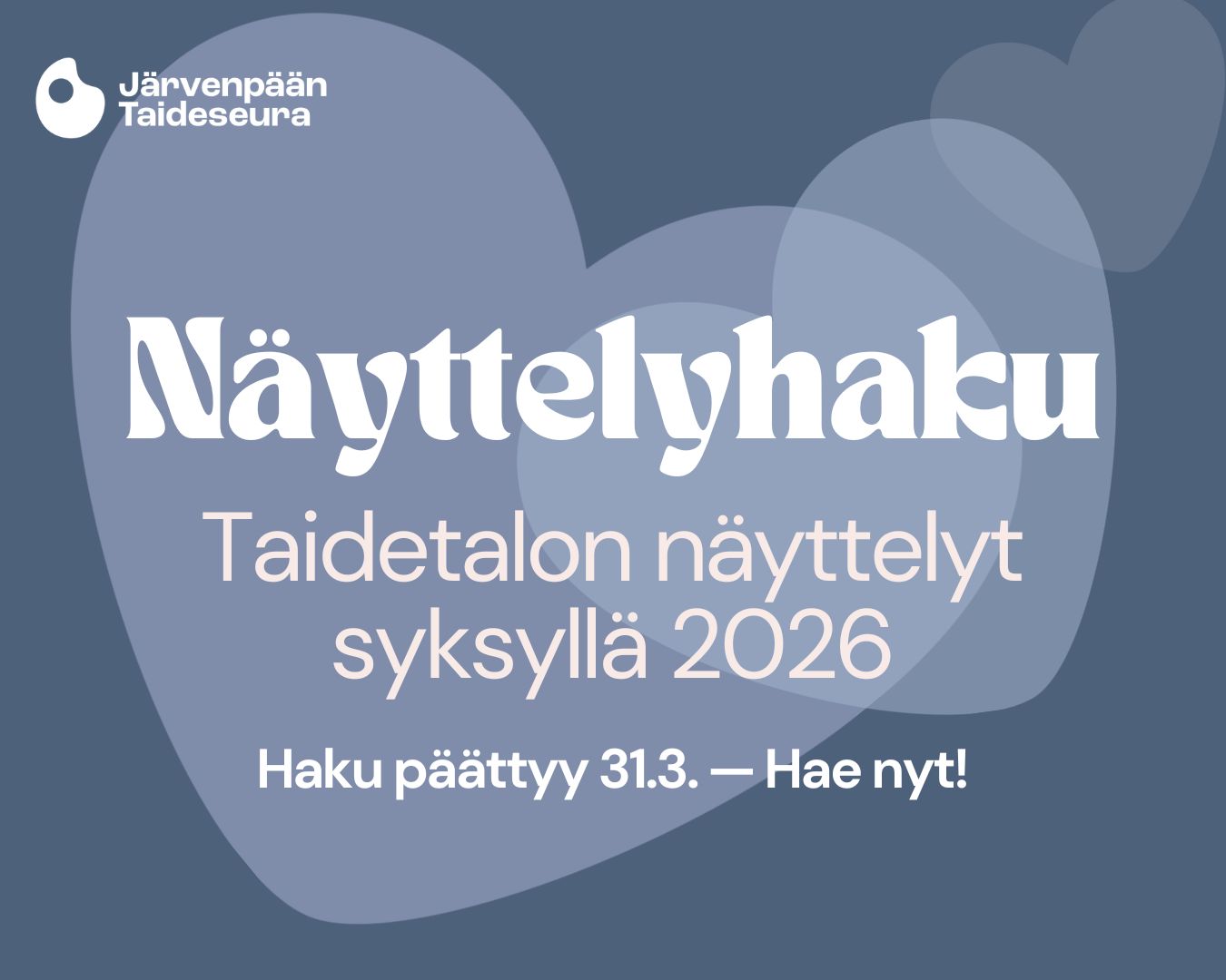 Tervetuloa hakemaan näyttelyaikaa Taidetalolta! Haettavat tilat: Galleria 1, Galleria 2 ja Studio.