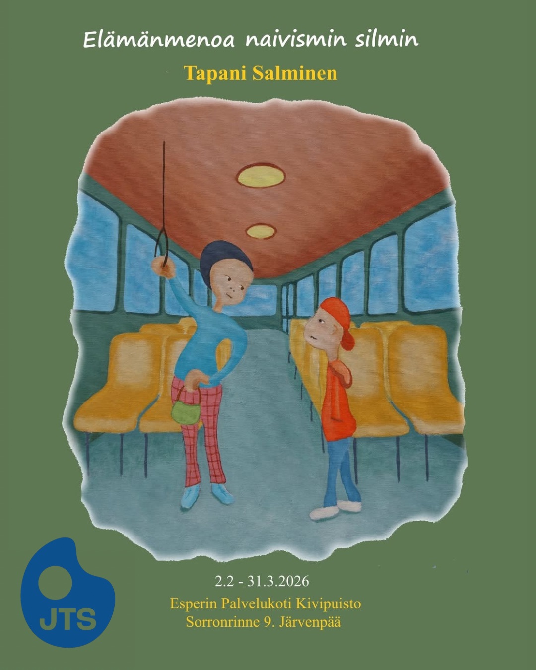 Taiteilija Tapani Salmisen hurmaavia, naivistisia akryylimaalauksia on esillä Kivipuistossa helmi- ja maaliskuun ajan.